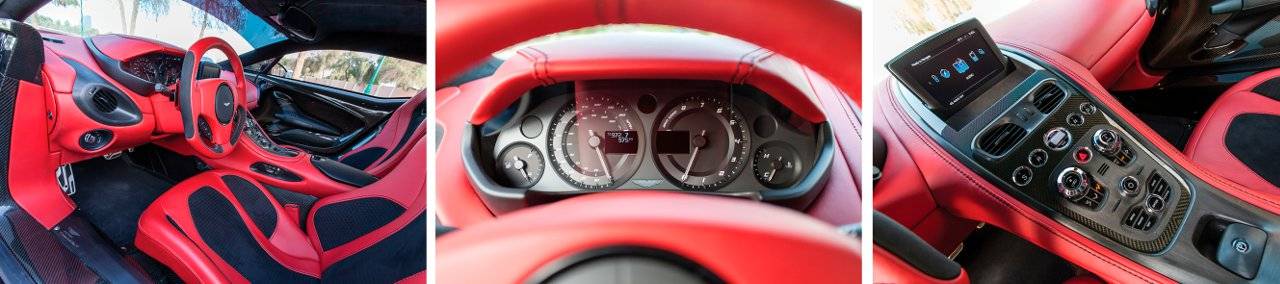 Интерьер Aston Martin ONE-77 продуман до мелочей. Глубокие ковши сидений, минимум кнопок на торпедо, небольшой руль, немного срезанный по хорде. Спидометр и тахометр – как на модели DB9 – с расходящимися стрелками. Все автомобили Aston Martin ONE-77 собирали индивидуально, причем это касалось не только отделки, но и настроек шасси. Поэтому не существует полностью идентичных ONE-77.